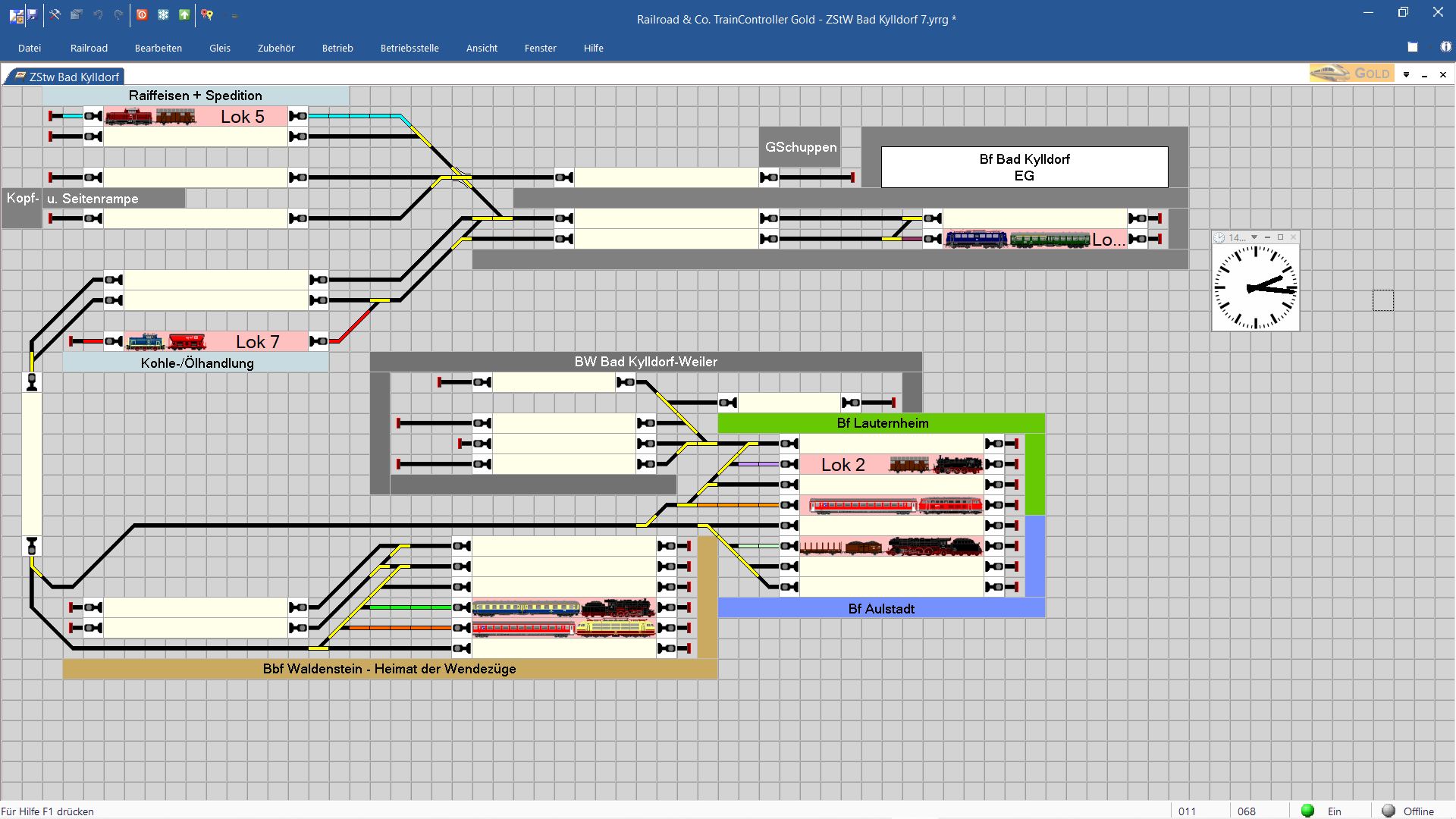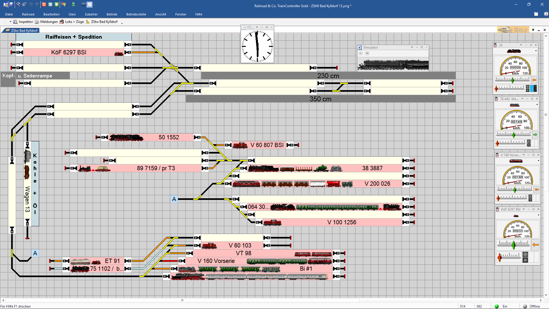 In einem ersten Schritt habe ich zunächst das Gleisbildstellwerk meiner Anlage erstellt, einige Triebfahrzeuge und Wagen zusammengestellt und dann ausgiebig mit dem Simulator "auf meiner Anlage" gespielt.
